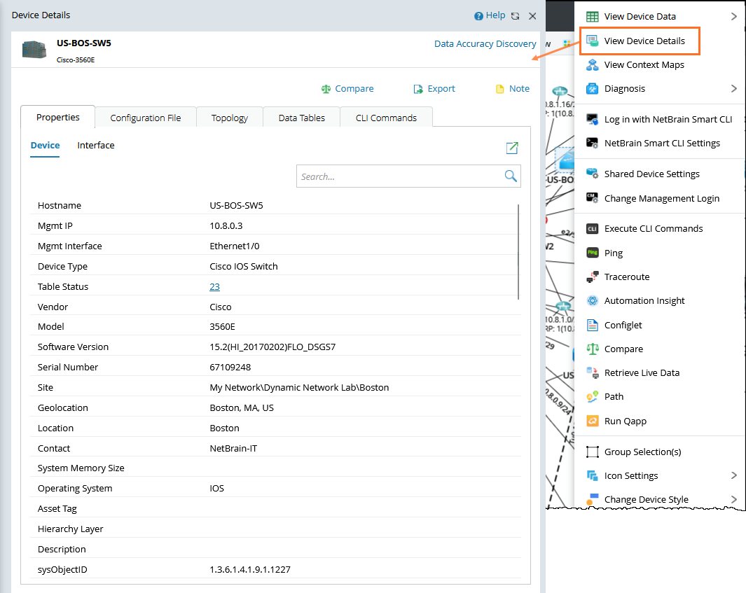 On the map, double-click a device or right-click a device and select View Device Details.