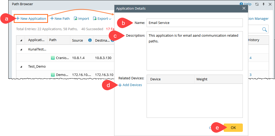 - When creating a new path, select the desired application from the Application dropdown to associate the path with it.