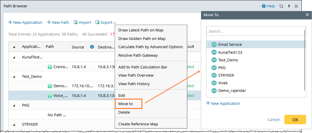 You can assign a path to a specific application to organize and manage it more effectively.- To move an existing path to an application: