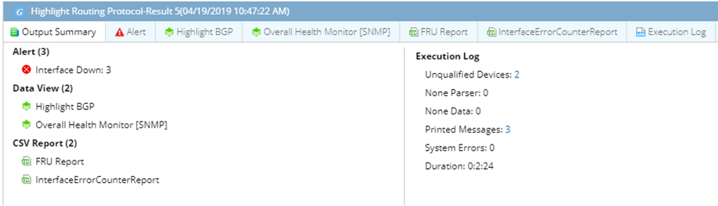 Alert: Displays events and alerts triggered at the device or interface level during Qapp/Gapp execution.