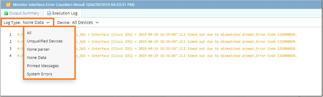 Execution Log: Displays detailed logs of the Qapp/Gapp execution, including error codes for root cause analysis. Filter logs by log type and device to narrow down the data.