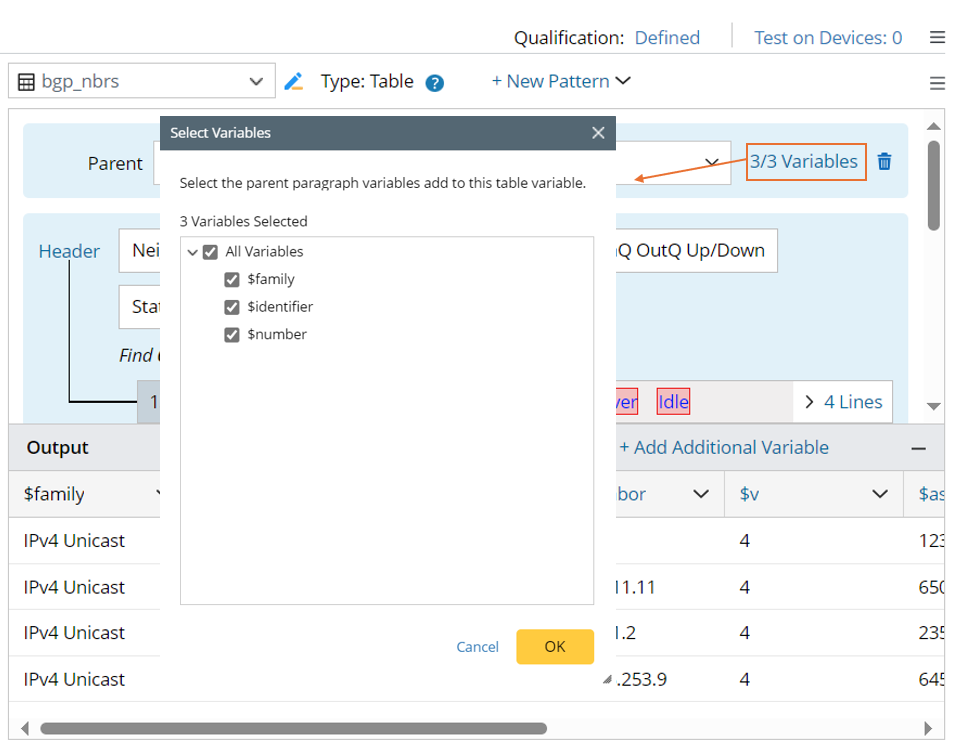- In the bgp_nbrs pattern, click Add Parent to add the parent paragraph.