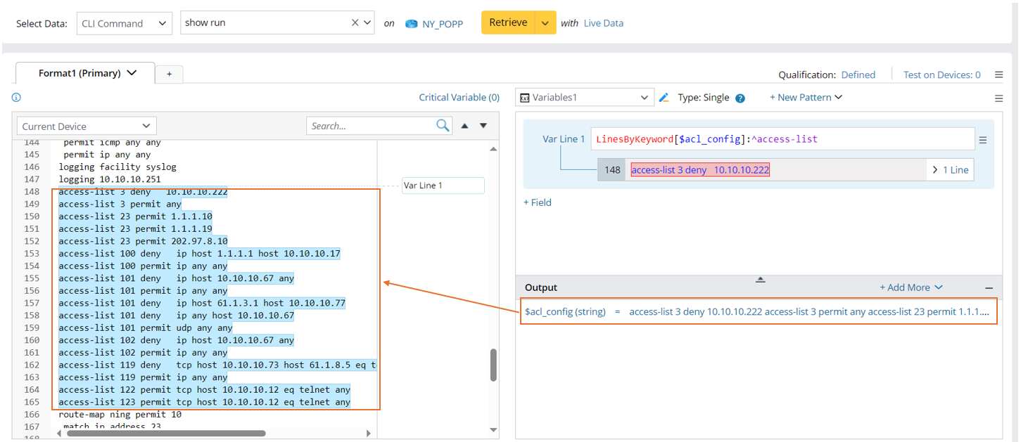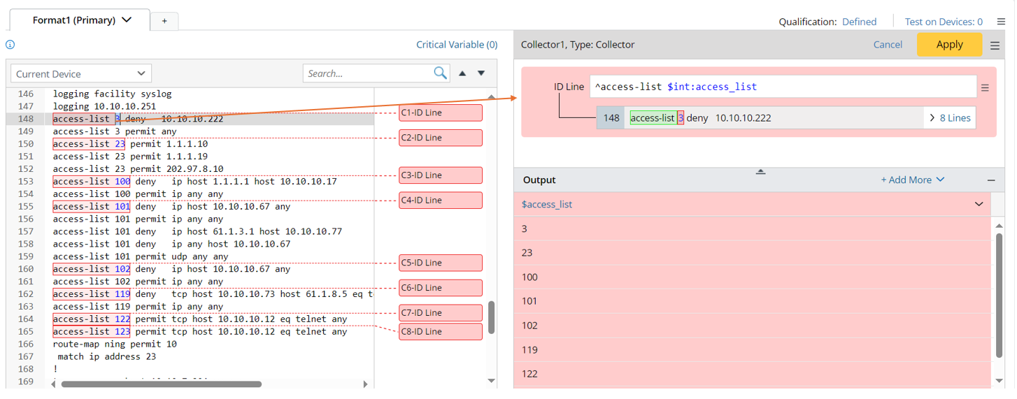 - Double-click 3 in line 148 to parse the variable access_list in a collector pattern, then manually change the ID Line to ^access-list $int:access_list.