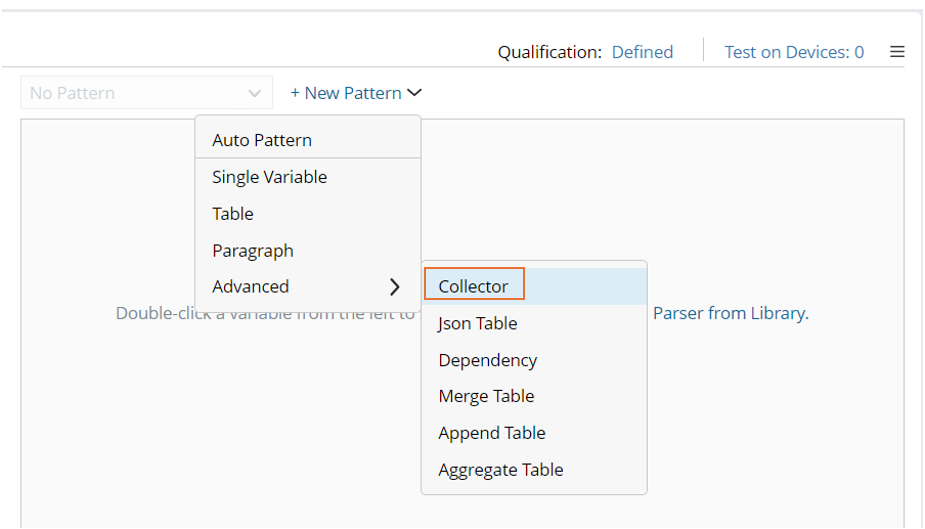 - Click + New Pattern > Advanced > Collector to create a new collector pattern.