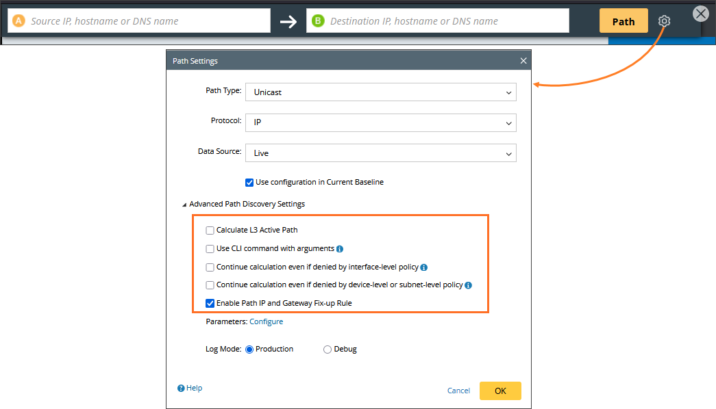 - Enable Path IP and Gateway Fix-up Rule (enabled by default) — Whether to enable the path gateway fix-up during a path calculation. See Path IP and Gateway Fix-up for details.