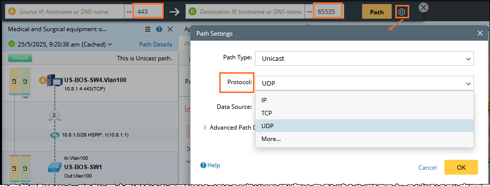 UDP | Calculate a path for UDP. Additional port information needs to be filled in. |