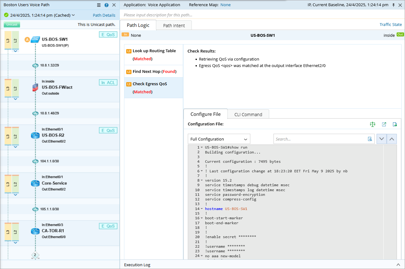 With the parameters configured, the system checks the ingress and egress QoS information at each hop and calculates the path based on QoS policies.