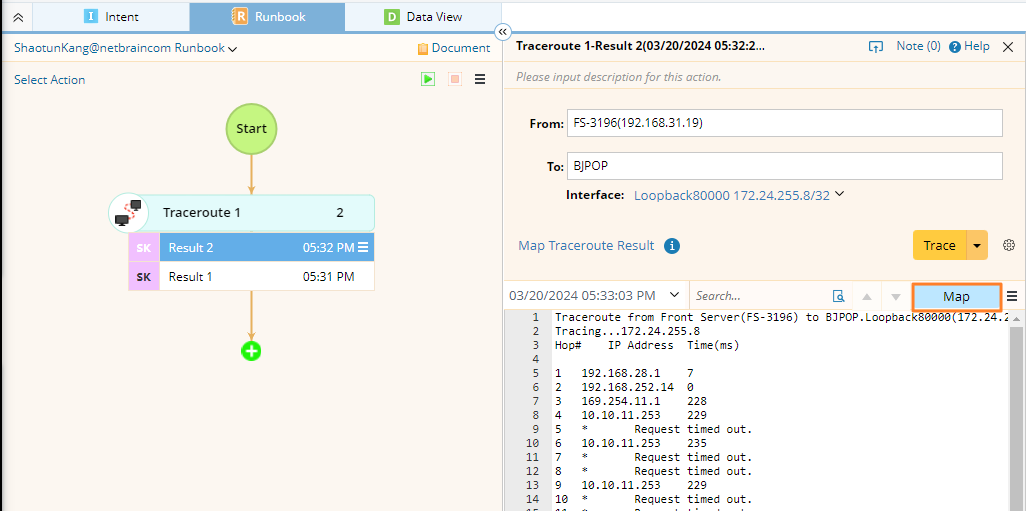NetBrain dynamic path feature visualizes the forwarding of the packet and emulates the real packet forwarding process by looking up route tables in your live network and provides end-to-end visibility across any network path. Besides looking up route tables to find the next hop, It can also look into PBR, NAT, ACL, firewall policy and other traffic control technologies to ensure the correctness of a path.