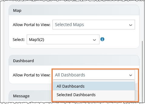 The portal supports viewing All Dashboards or specific Selected Dashboards. By default, all dashboards in the dashboard pane are visible to portal users. Power users can also select the specific dashboards that portal users can see.