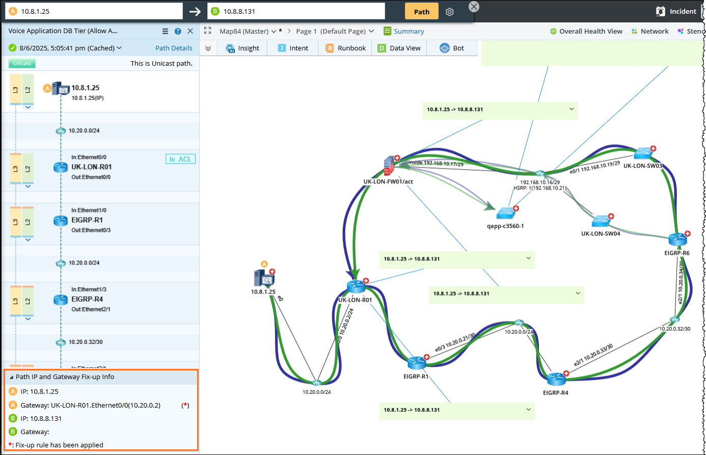 When you start a path calculation, the system will check if the destination and source match any fix-up rules. If yes, the system will use the fix-up gateway or IP replacements (if defined in the fix-up rule) to calculate the path.