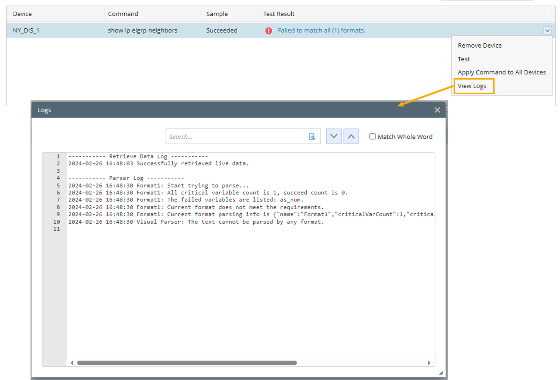 - Click Test on Devices:1 to navigate back to the Test Parser Coverage window.