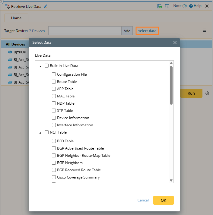 Select Data Type(s): Click Select data to add more data types (e.g., interface status, route tables).