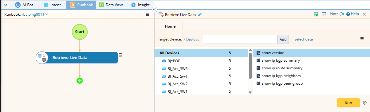Tip: If a runbook is already open, the Retrieve Live Data node will be added to the current Runbook. Otherwise, it will be added to your personal Runbook. - Select Target Devices: By default, all devices existing devices on the map are selected. To customize the target devices, click the hyperlink next to the field Target Devices and choose specific devices.