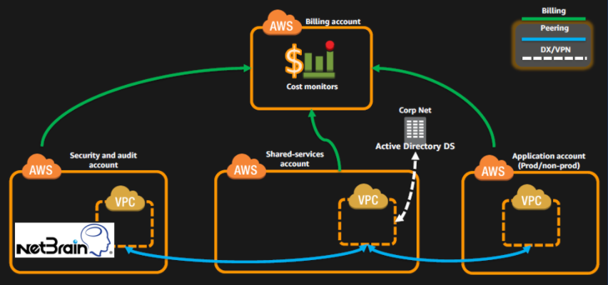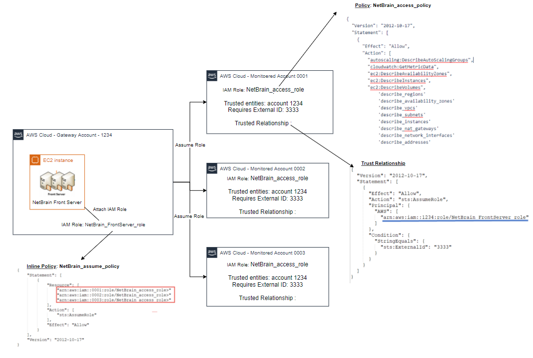 Once the appropriate role and policy have been configured, the NetBrain Front Server can read the network configurations and run statistics from the monitored accounts.