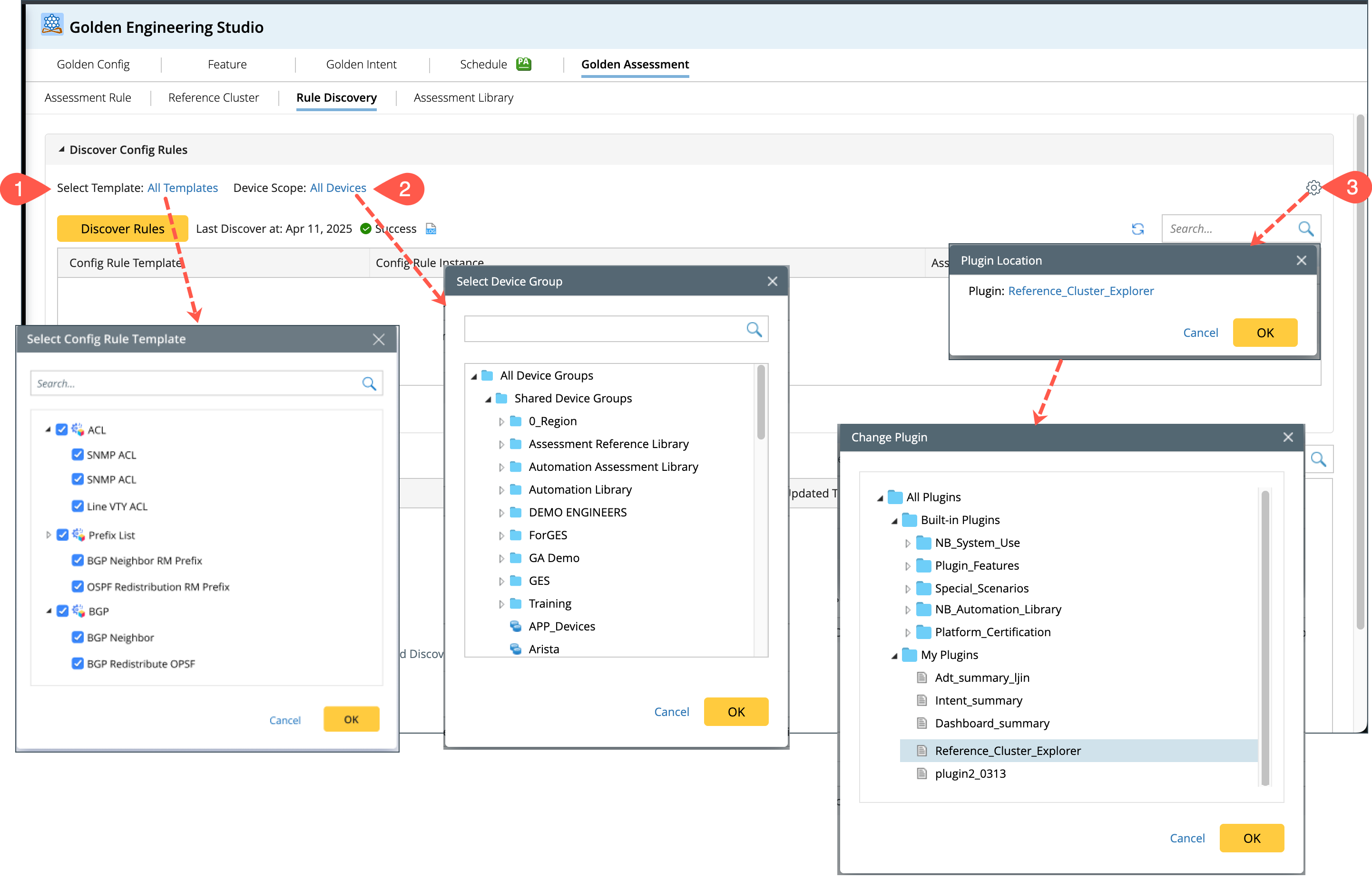 Discovering and creating config rules in the current network can be difficult and time-consuming. Rule Discovery is introduced to discover the config rules in the existing network using the pre-built config rule template. It will discover the existing config rules in the network and further create assessment rules and golden configs automatically. These config rules can be enforced via preventive automation, eliminating the amount of time and resources required to create these rules. The procedural sequence to discover and build rules is: