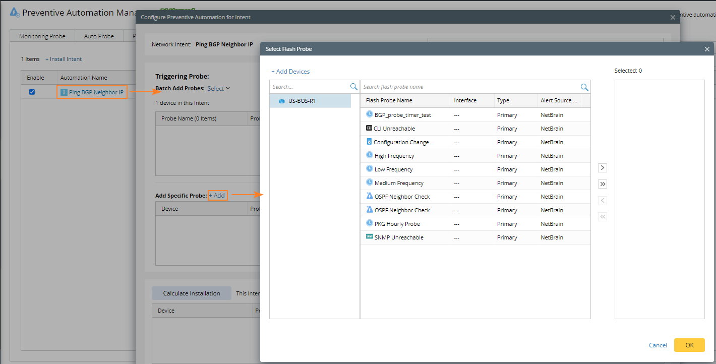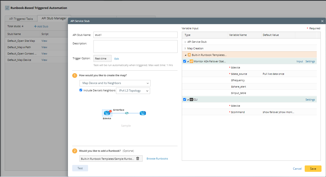 A Flash Probe can be added to an NI and a backend process can monitor the whole network's status periodically. When a flash alert occurs, the system will further execute NIs. You can view the triggered NI results with the flash probe via Execution Tree. For example, HRSP NI can be installed as triggered automation of the HSRP state flash probe of the device BJ-L2-Core-A. When an alert occurs on the flash probe, you can trigger the NI to execute automatically.