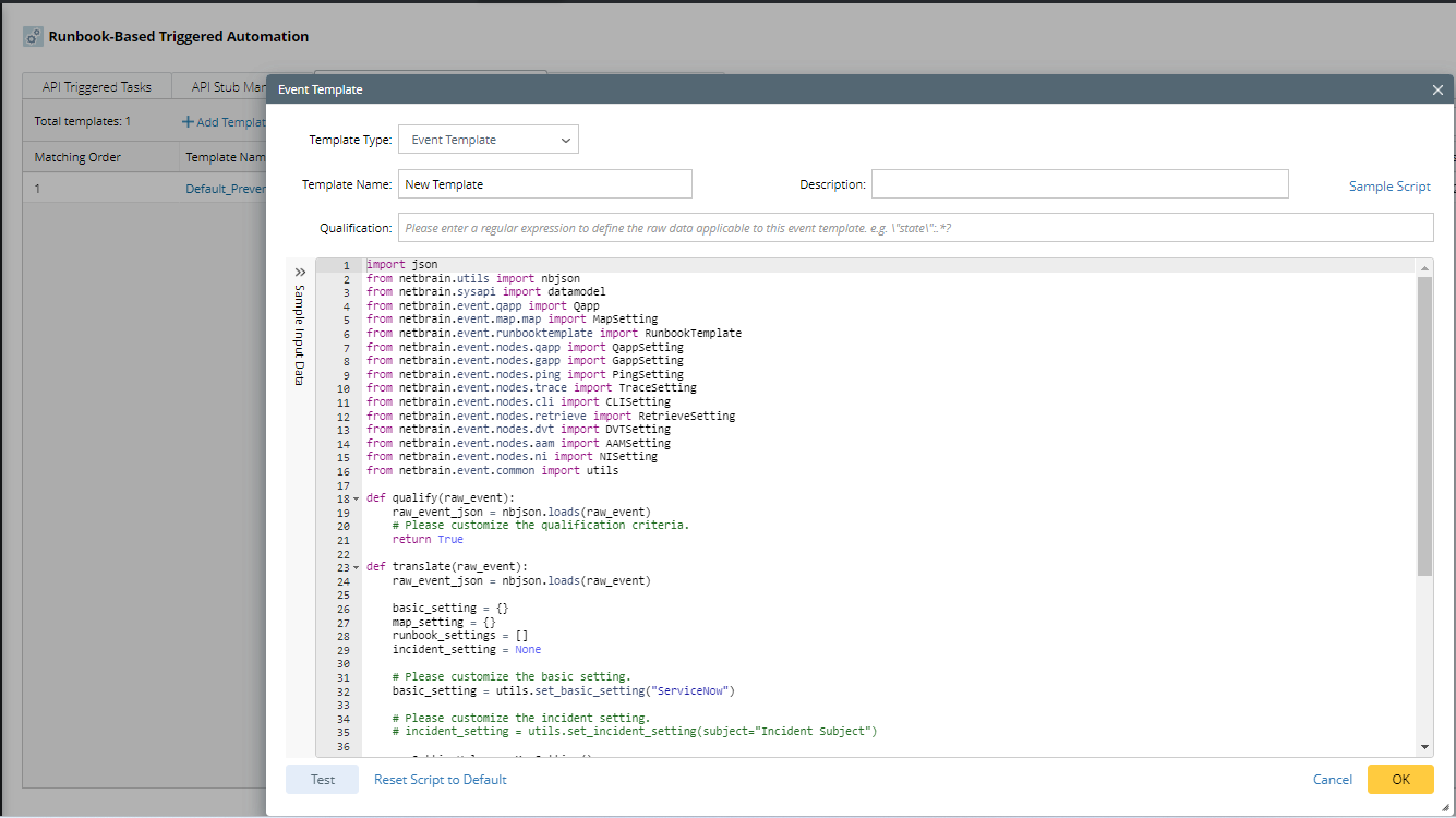 The typical use case is that the 3rd-party system will trigger NetBrain Runbook Template execution, including an NI node. For example, a ticket is created since a BGP neighbor of a core device is flapping, which triggers an API call to the NetBrain System, and the device name and BGP are sent to NetBrain as a keyword. A NetBrain Runbook can filter NIs related to this device and BGP and execute these NIs.