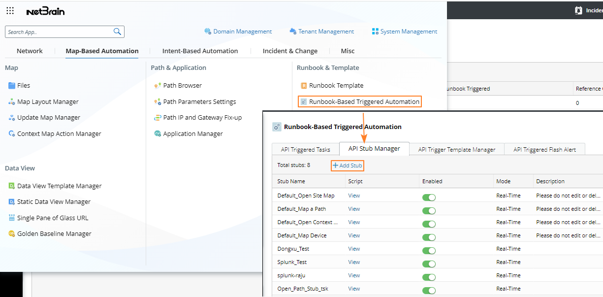 The first step to create a runbook-triggered automation is to create an API Stub in NetBrain.
