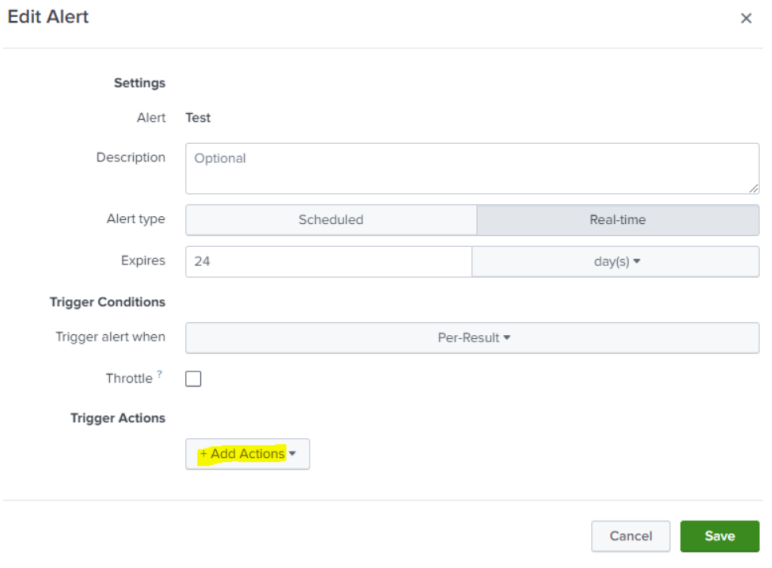 - Create a new alert or edit an existing alert by navigating to the Alert tab in Splunk.