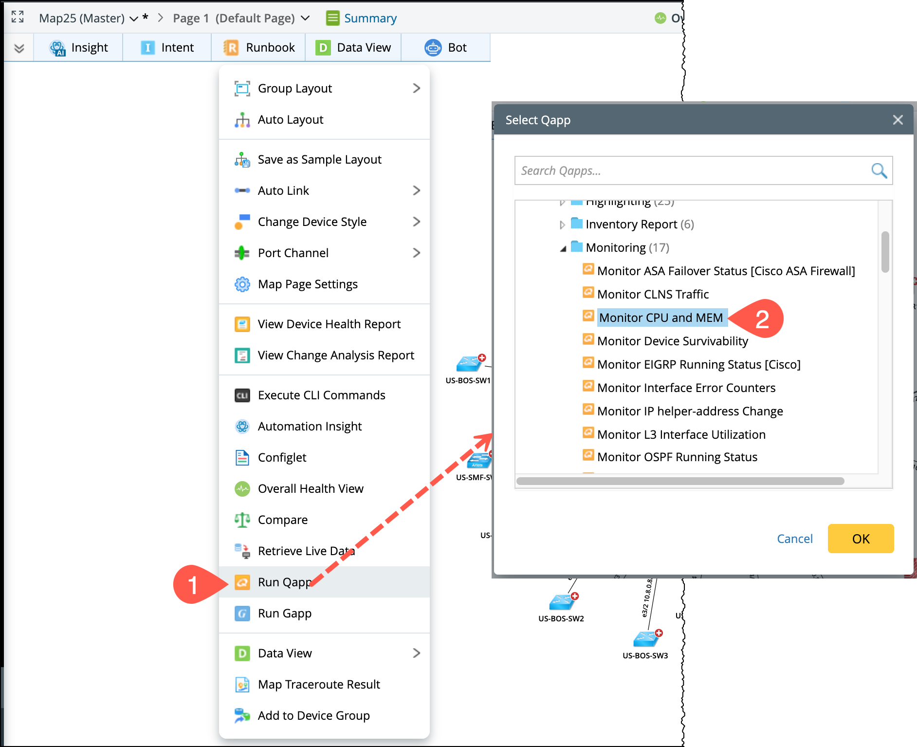 Example: Running the built-in Monitor CPU and MEM Qapp from a map.