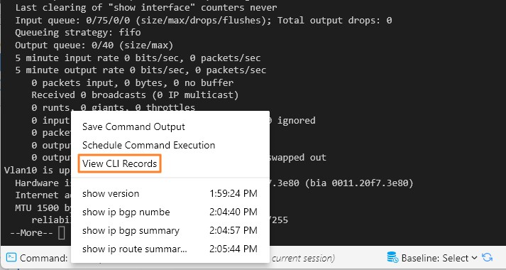 - In the View CLI Records dialog, right-click the target command and click Save Command Output.