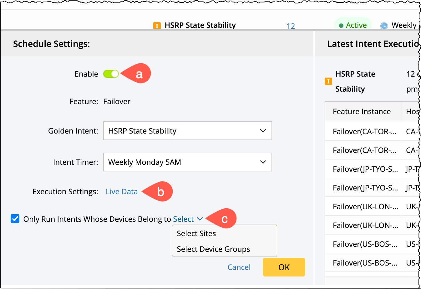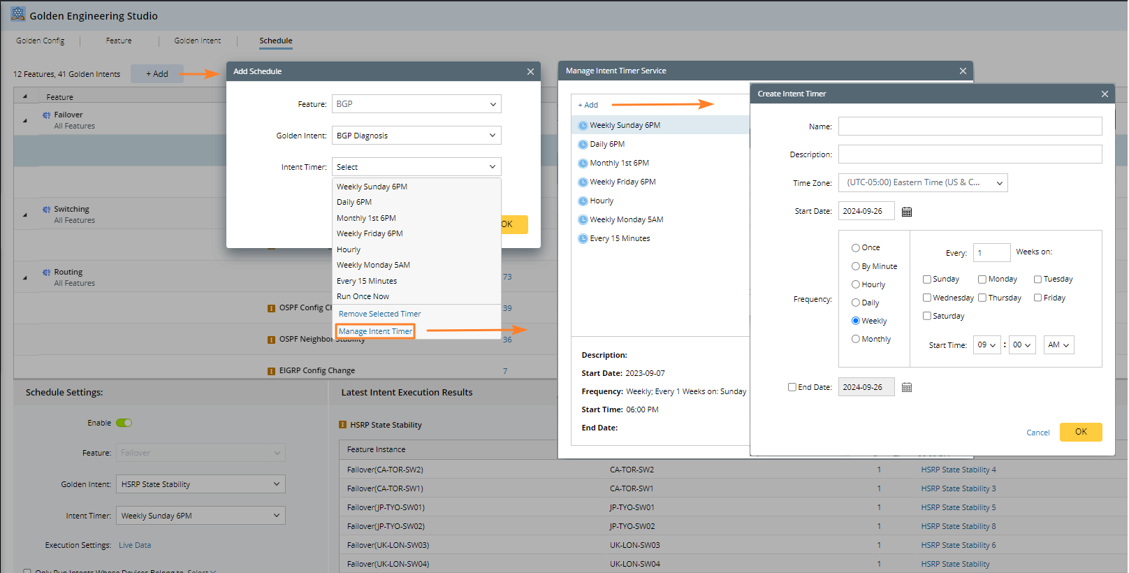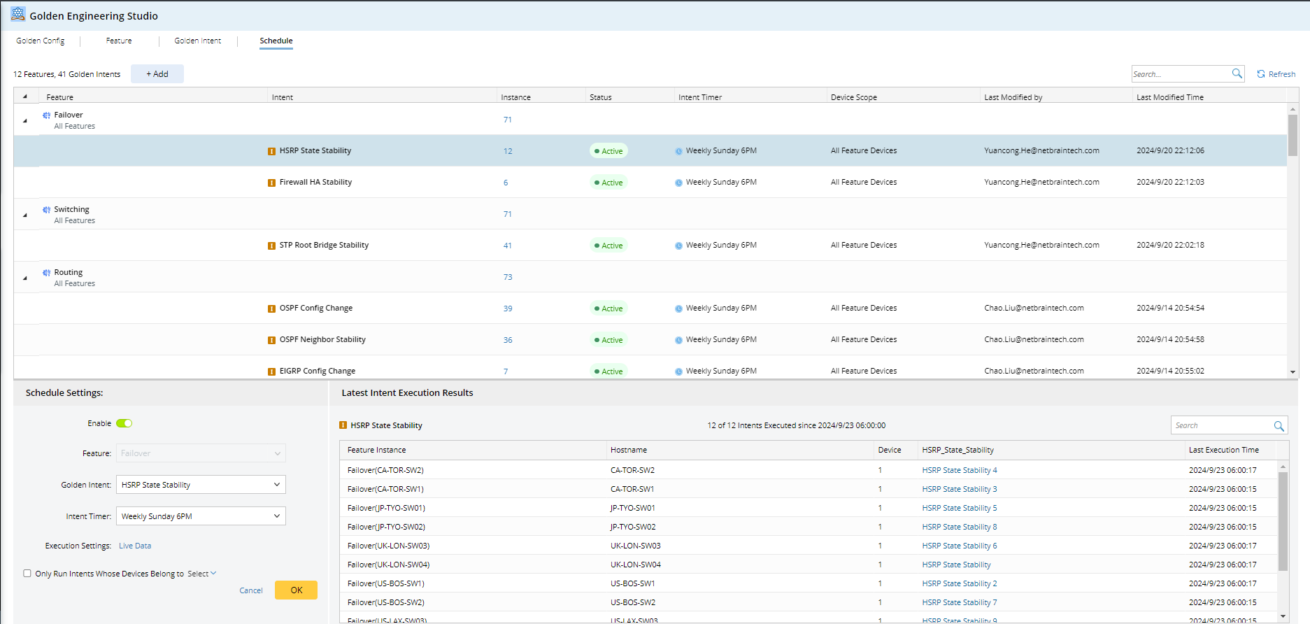 Schedule Golden Intent enables users to batch and schedule the execution of golden member intents for periodic network diagnostics, supporting preventive automation. The result of the scheduled execution can be viewed/browsed through the dashboard or golden intent pane.