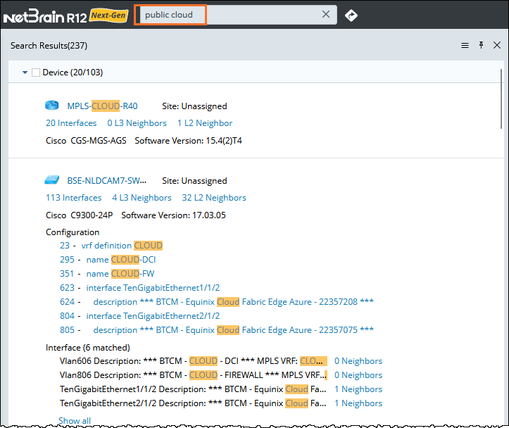 Note: In the search results, the cloud type of the resulting cloud will be displayed. The NetBrain System supports various cloud types: MPLS L3 VPN, AWS, Azure, GCP, Aryaka DC Cloud, and Internet Cloud.