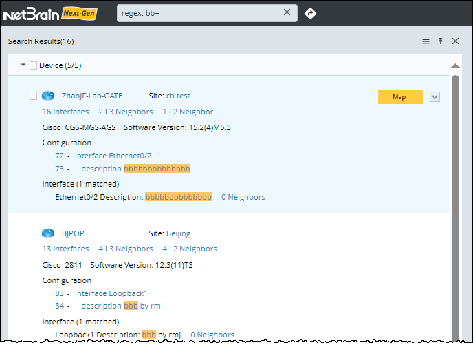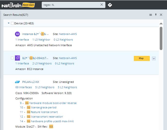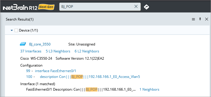 Note: Device config texts may contain "{" and "}". When searching for the device with keywords containing "{" and "}" (for example, "BGP {"), "{" and "}" will not be treated as a separator. |