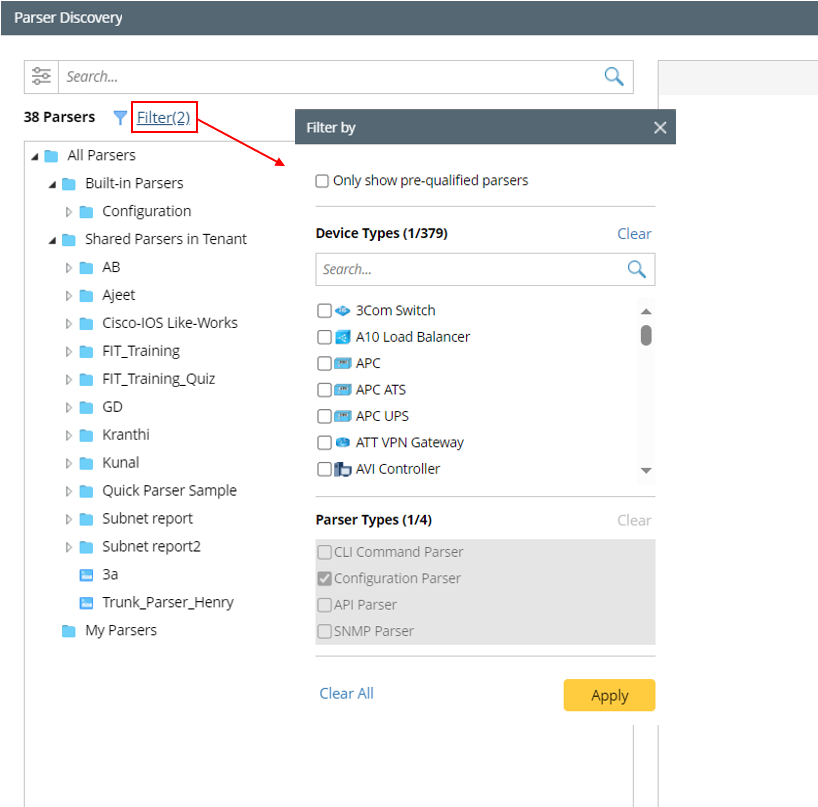 To narrow down your search results, you can use the Filter function to filter out results by device type and parser type.