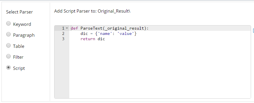 The Script method is much more flexible and usually used for complex configuration cases. The following sample case is to define a simple script Parser.