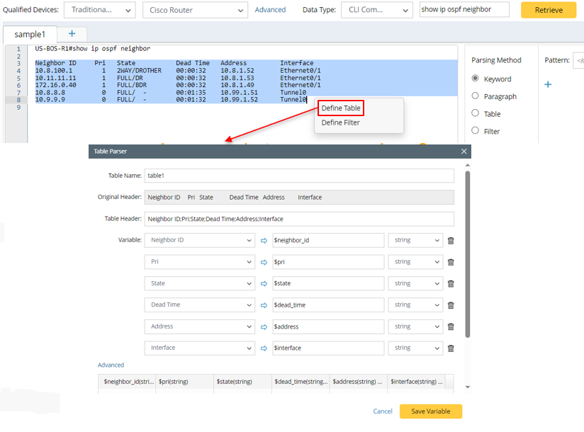 - Enter the show ip ospf neighbor command and retrieve sample data in the Parser Editor page. The sample output is as follows: