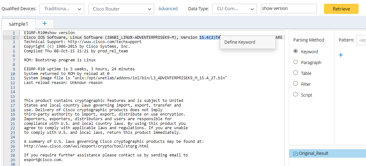 - Enter the show version command and retrieve sample data on the Parser editor page.