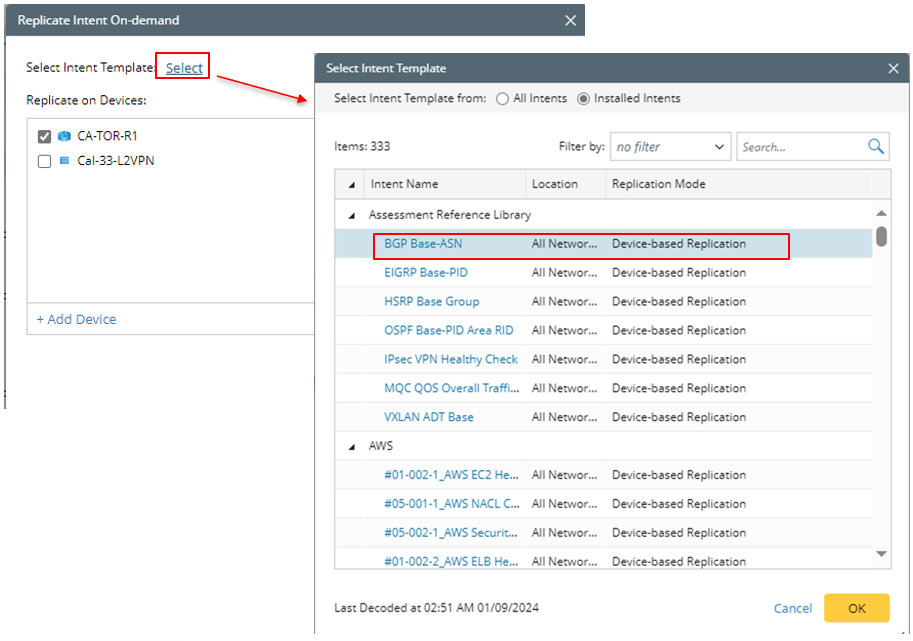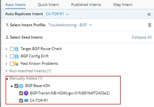 Apart from the intent templates already listed in Auto Intent, additional ones not installed and decoded in IBA Center can be added and used in Auto Intent. This offers more flexibility to use intents in Auto Intent. After the intent and device are added, new intent can be replicated on the selected device with the retrieved baseline data decoded from the selected intent template. The intents created in this way will be added to the “Manually Added” section.