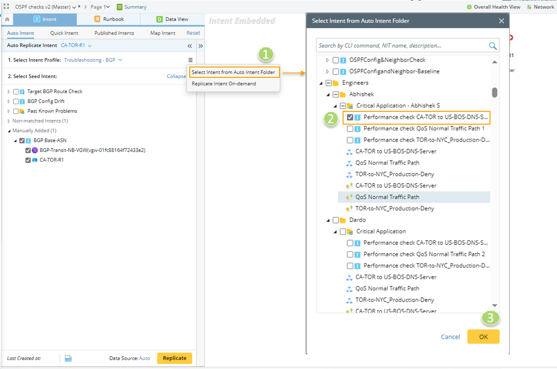 - Click Ok. The intent template and device you selected will be added to the Manually Added section in the Auto Replicate Intent pane.