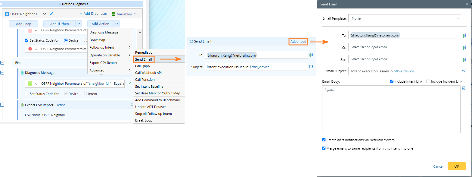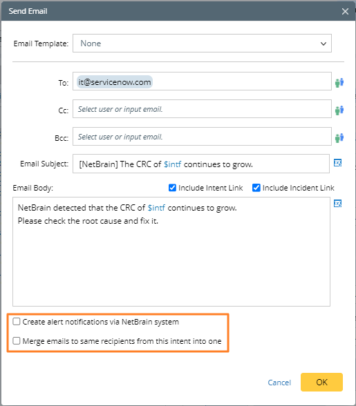 - Create alert notifications...: Set whether to send the email content as an alert notification to the NetBrain user.