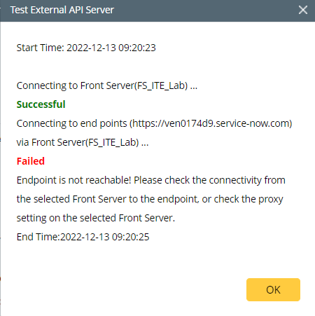 Error Scenario: Endpoint is not reachable! Please check the connectivity from the selected Front Server to the endpoint, or check the proxy setting on the selected Front Server.