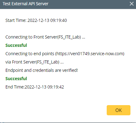 Note: Devices must be assigned to each corresponding API Server, otherwise, there is no ServiceNow ticket result on the map. - Once the successful connection with the ServiceNow instance has been confirmed, click OK to finalize the ServiceNow connection.