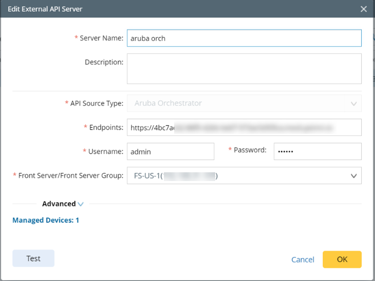 - Select the API Source Type as Aruba Orchestrator.