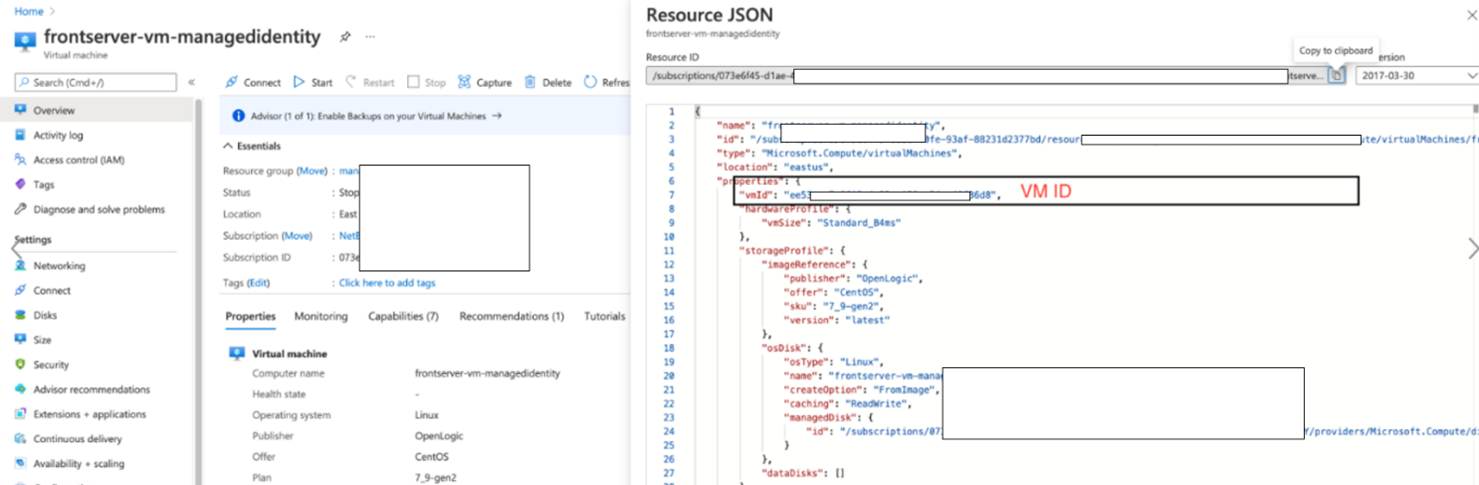 - Find the management Client ID, Object ID(PrincipalId) or Resource ID from Json view of Azure Portal.