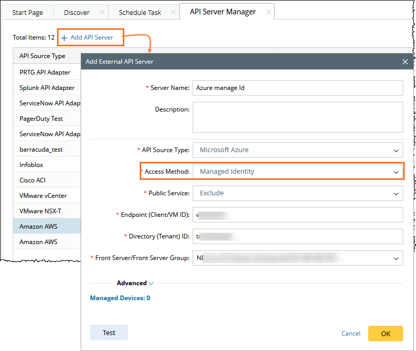 - Front Server/Front Server Group: select one front server VM with managed identity to access Azure.