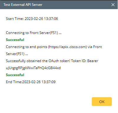 - Click Test to initiate a connectivity test between the NetBrain front server and the Cisco SNTC API configured.