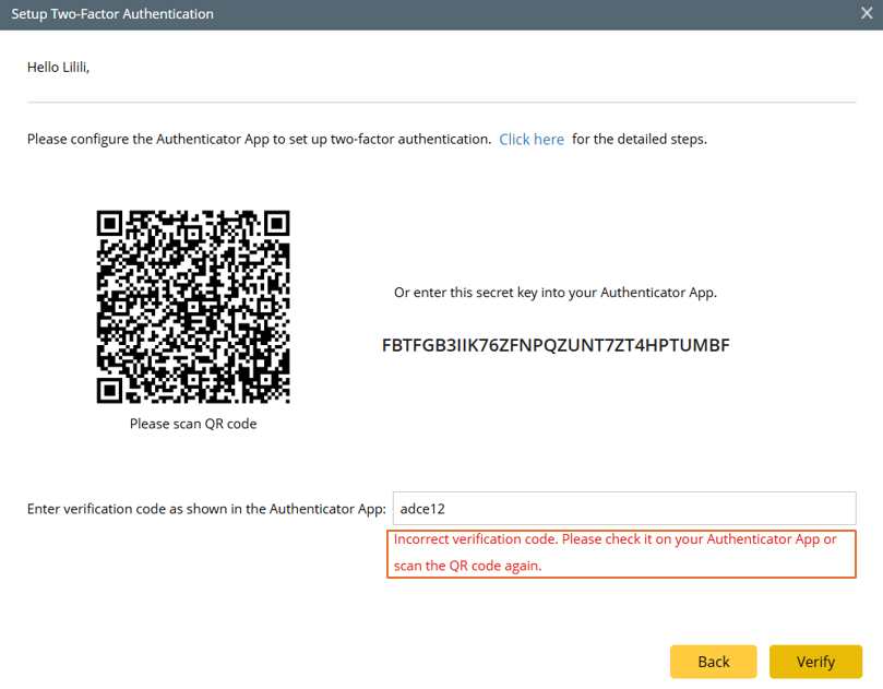 Note: If the verification code is incorrect, error message will appear.