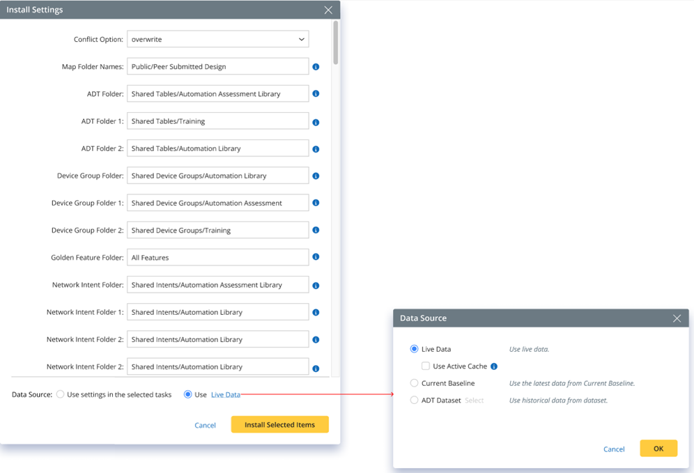 Installing Resources via NetBrain Download is the primary method for initiating installed resources (for more information, see Install and Reinstall Task). You can specify the data source for these resources during library installation. To facilitate this, Data Source options are provided: