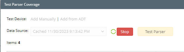 Tip: The Cached Data, ADT Dataset, and Cached Data(from live retrieval) enable users to retrieve data from selected testing devices once, but test the parser multiple times after each parser modification for debugging, without reduplicative live retrieval.