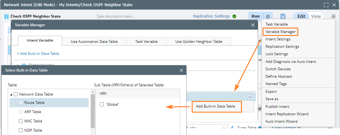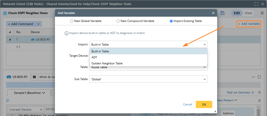 You can use the built-in data (e.g., Route Table, NCT) to define diagnosis in intent, for example, loop the OSPF Neighbor table to check the neighbor state.