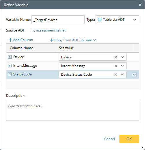 Set Values: Select candidate values from ADT columns or define dependencies using device/interface properties. The rules here are consistent with defining candidate values in the input dialog.