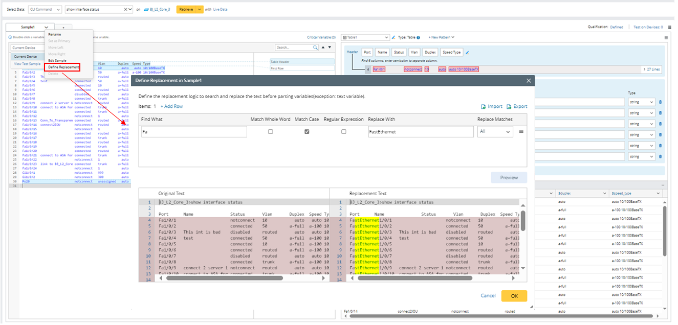 - Click +Add Row, then set to replace Fa with FastEthernet. The options are described below: