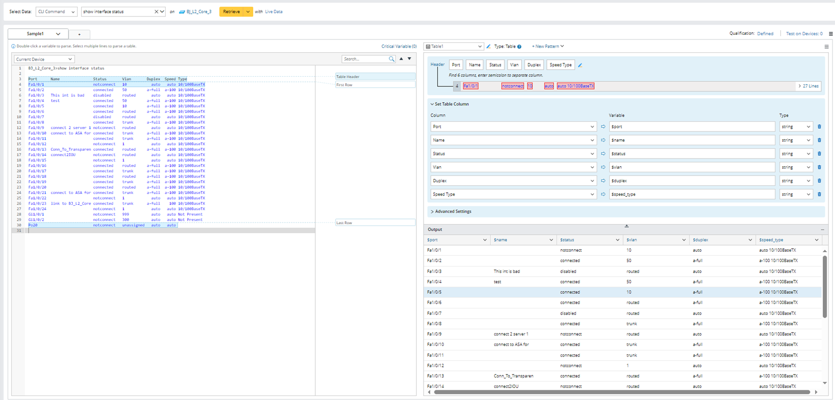 - Retrieve command data show interface status on the device BJ_L2_Core_3, then select several lines from the sample text to parser the table. The interface name is short name in the parsed results.