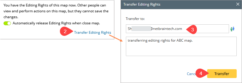 In addition to proactively releasing editing rights of a map or network dashboard, you can also transfer the editing rights to a specific user.