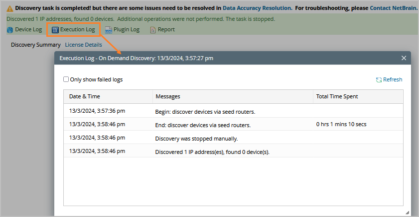 Then you can click on Execution Log to ensure the discovery task is completed successfully. The error or warning logs will be highlighted in red and are usually caused by NetBrain system failures, such as NetBrain services being stopped or the system having insufficient MongoDB disk space.